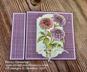 - My Zinnias are coloured with the following Stampin’ Blends – Granny Apple Green, Flirty Flamingo, Fresh Freesia