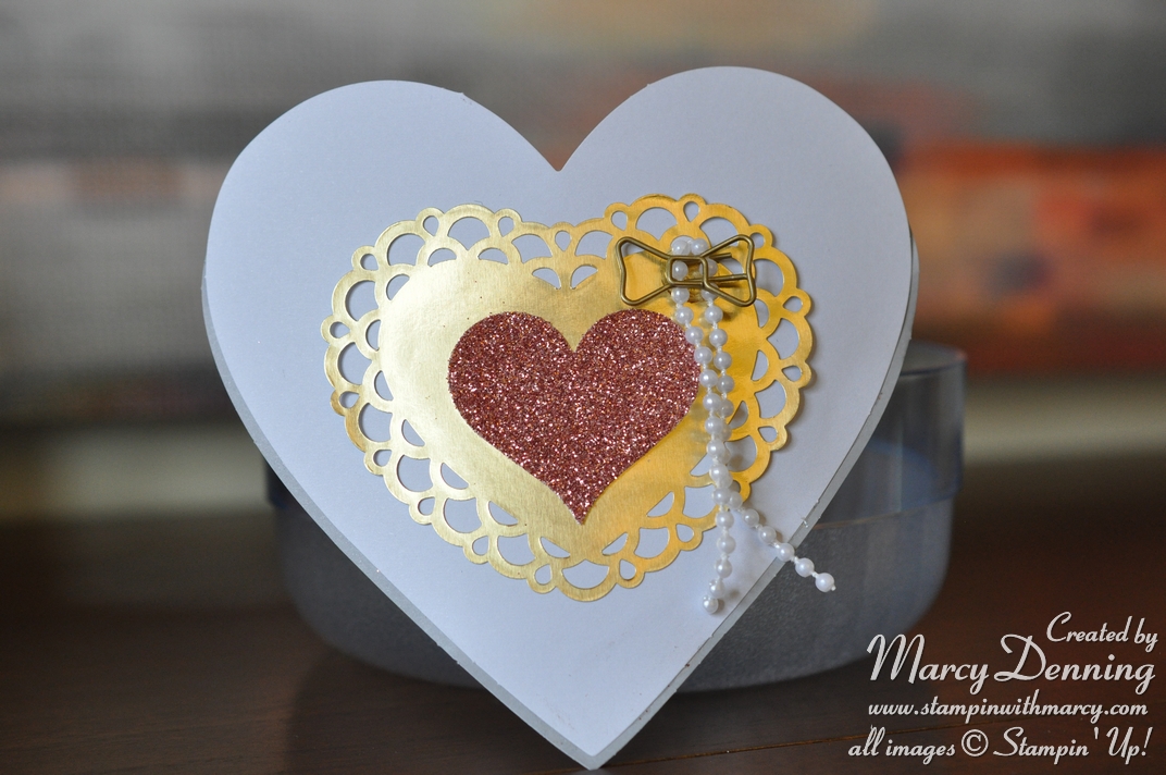 I used one of the foil heart doilies and some pearl trim from the Love Blossoms Embellishment kit along with a Bow Paper Clip and a heart punch out of the Blushing Bride Glimmer Paper to decorate the front of my treat bag. Super easy and super cute!