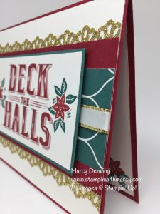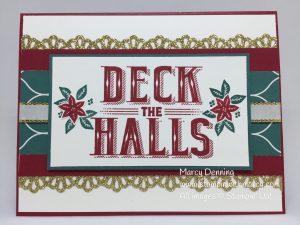 Finally my top layer is Very Vanilla that is cut to 4″ x 2-1/4″ that I stamped my sentiment Deck The Halls in Cherry Cobbler on. I also stamped the leaves in Tranquil Tide on this and die cut out the stamped poinsettia (yes, their is a coordinating die!!).