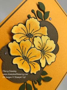 Thick Whisper White card stock, I stamped the large flower cluster onto this using Tuxedo Black ink. I then used the Mango Melody Combo Pack of Stampin’ Blends to colour in the flower petals and the Light Soft Suede Stampin’ Blend for the flower centers. I then fussy cut out the flowers and arranged them on the Soft Suede layer. Once I glued them on, I went over the petals with my Clear wink of Stella Glitter Brush.