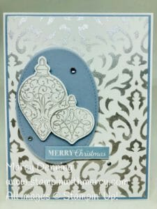 Today’s card is one I created during my Facebook Live on Thursday September 5, 2019 using the Christmas Gleaming Bundle (stamp set and punches), Basic Pattern decorative Masks and the Silvery Shimmer Delicata pigment ink from the Stampin’ Up! Holiday Catalogue