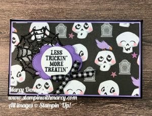 Highland Heather cardstock – one piece – 3-3/8″ x 5-7/8″, two pieces – 7/8″ x 5-7/8″, two pieces – 7/8″ x 3-3/8″, plus a piece to die cut out the label from the Frightful Tags Dies