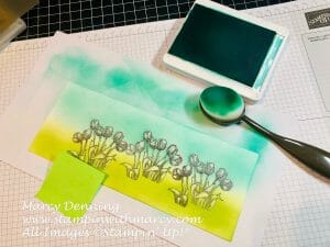 You need to first stamp the image on some repositionable tape and let it dry overnight so it doesn’t smudge, then fussy cut out the images. Stamp your images on your card then carefully pace each mask over the stamped image